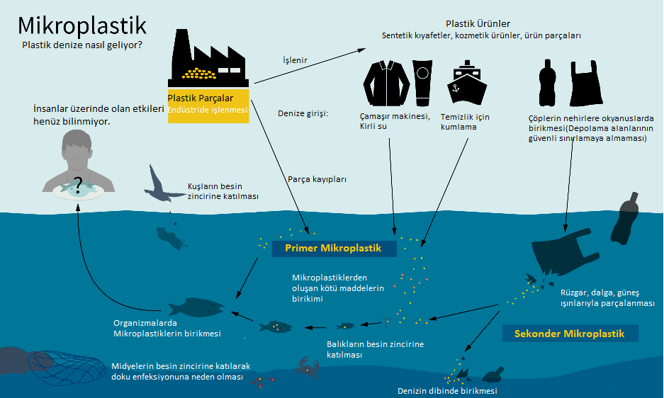 Bu mikroplastikler, deniz ekosistemine doğrudan ve dolaylı yollarla, örneğin çöplüklerden rüzgârla taşınarak nehirlere ve denizlere karışırlar. MDPI’de (Molecular Diversity Preservation International) 2021’de yayımlanan bir çalışmada “Her yıl 8 milyon ton plastik denizlere ve okyanuslara karışıyor” denildi.